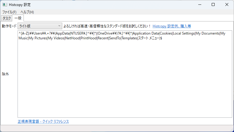 バックアップから除外したいファイルやフォルダ(フルパス)を .NET の正規表現 で指定します。本体(コマンドラインツール)の除外(-x スイッチ)を指定しないときは、ここの内容が自動的に適用されます。