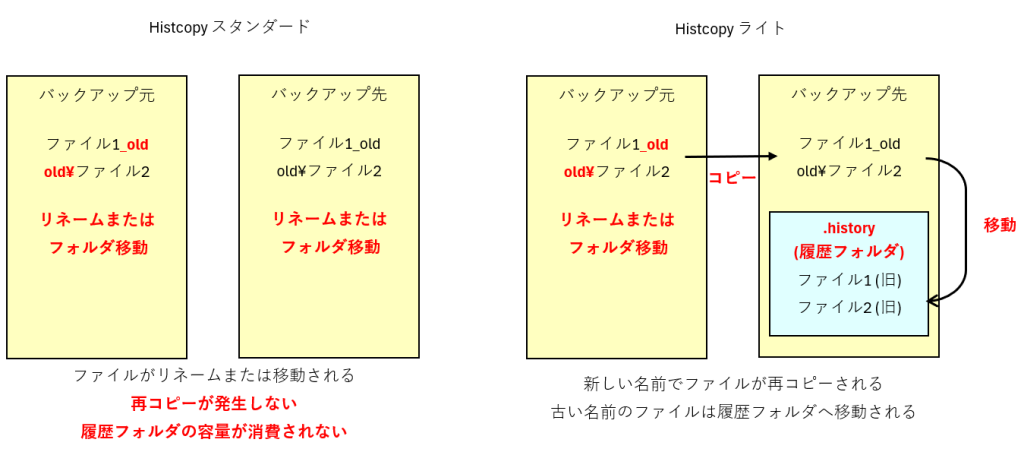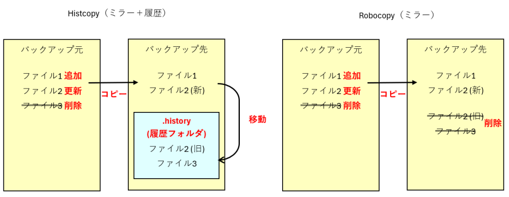 Histcopy は、基本的にはバックアップ元とバックアップ先を同じ状態に保ちます(robocopy のミラー処理と同じ動作をします)。ただし古いファイルは削除せずに別の場所(履歴フォルダ .history)に保存します。誤ってファイルを更新・削除した場合でも、簡単に元のファイルを復元することができます。