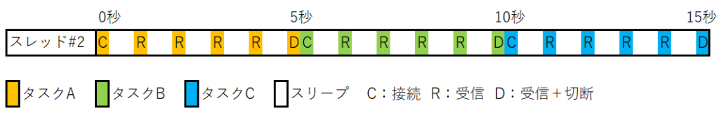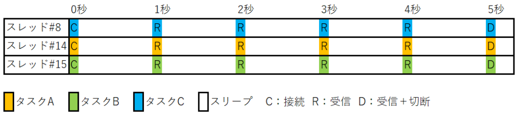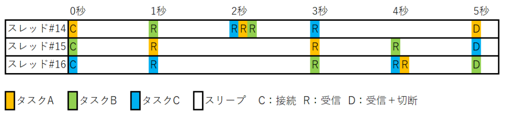 普通の関数(同期関数)を3回呼び出しています。5秒のタスク3個が逐次処理されており、約15秒で処理が完了しています。データ受信待ちの間はスレッドがスリープしています。