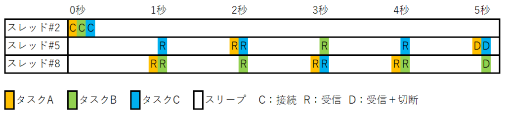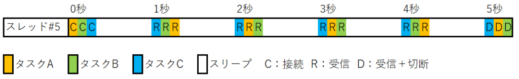 非同期関数を3回呼び出した後、処理が完了するのを待っています。5秒のタスク3個が並行処理されており、約5秒で処理が完了しています。最初の接続処理以外はマルチスレッドによる同時実行(並列処理)も行われています。